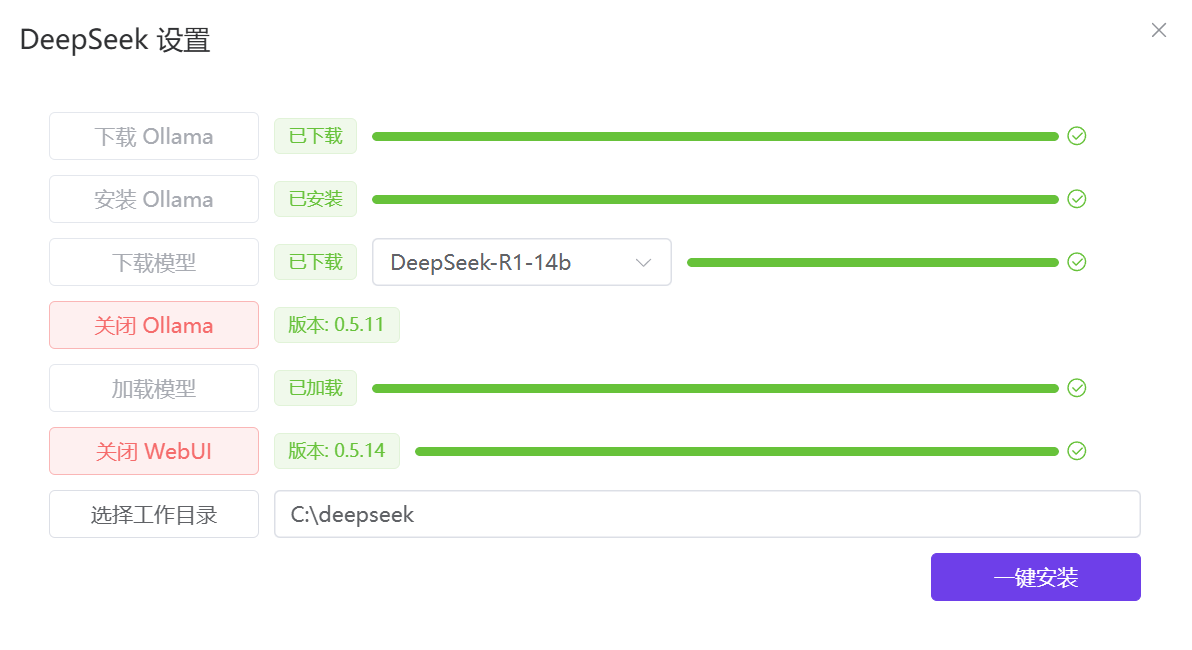 - 从导航切入 DeepSeek 一键安装和启动!安装过程中会根据电脑配置自动匹配模型大小。