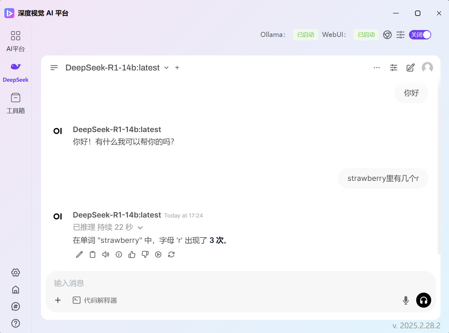 为了解决这些问题,我们将所需的依赖都打包到了一起,使用深度视觉 AI 平台可一键在本机部署DeepSeek。